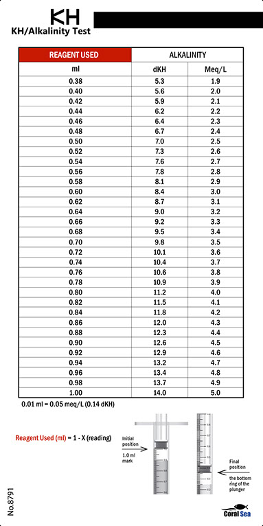 Add the first 0.4 ml of Reagent (equivalent to an alkalinity of 2.0 meq/L – 5.6 dKH) by pressing the end of the syringe while gently swirling the vial.